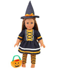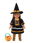 - 18-Inch Doll Costume: A classic black, orange and white witch costume. Black and white striped leggings and a witches hat complete this look. Easy velcro fasteners make it easy to put the outfit on your doll.